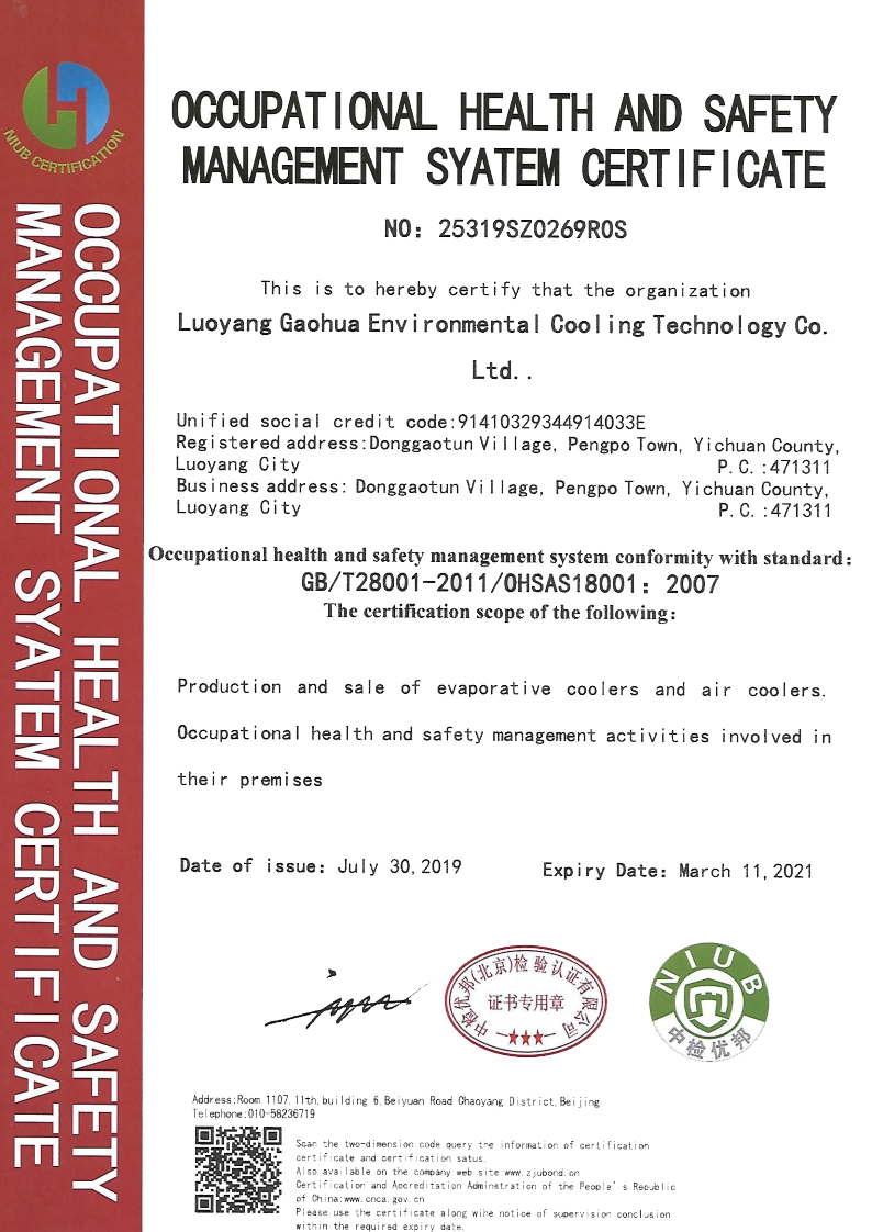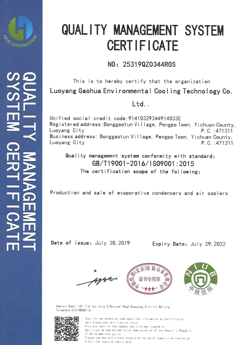 在洛陽高華環保公司全體員工及合作伙伴的不懈努力下,經過認證公司專家的***、嚴格、細致的指導和審核,確認洛陽高華環保冷卻科技有限公司的蒸發式冷卻(凝)設備、空冷器的生產和銷售的質量管理體系符合:GB/T19001-2016/ISO9001:2015 標準的要求,并于2019年7月30日,向洛陽高華環保冷卻科技有限公司正式頒發了ISO9001質量管理體系認證證書。